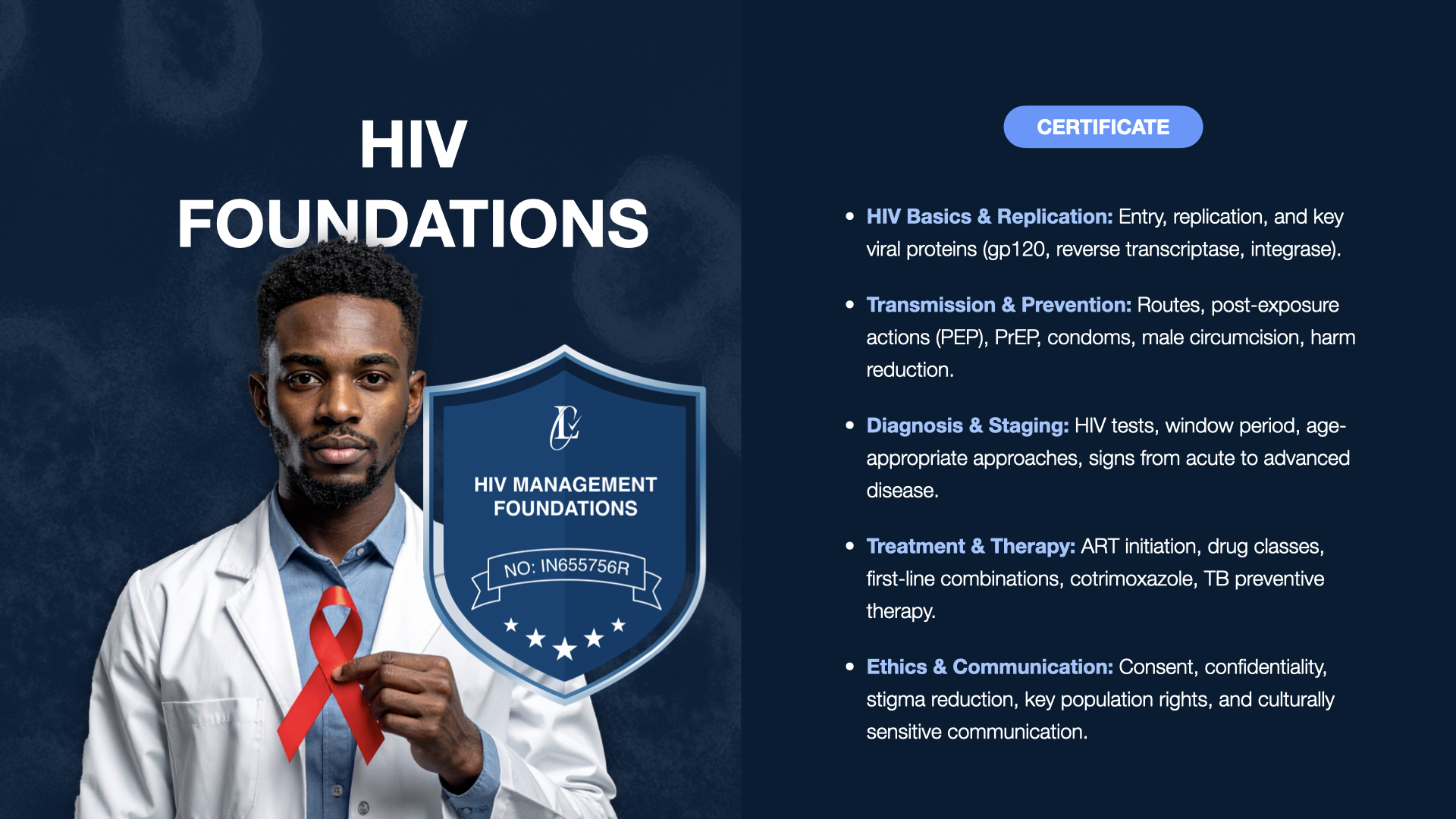The HIV Foundations Certification Assessment is a comprehensive, guideline-aligned evaluation of core HIV knowledge and clinical reasoning. It covers virology, testing, ART, prevention strategies, opportunistic infections, and ethical care. Drawing on WHO, UNAIDS, and CDC guidance, the assessment reinforces key principles such as stigma reduction, disclosure counselling, and rights-based care for vulnerable populations. Ideal for healthcare providers and trainees, it supports competence in delivering person-centred HIV services and achieving the global 95–95–95 targets.